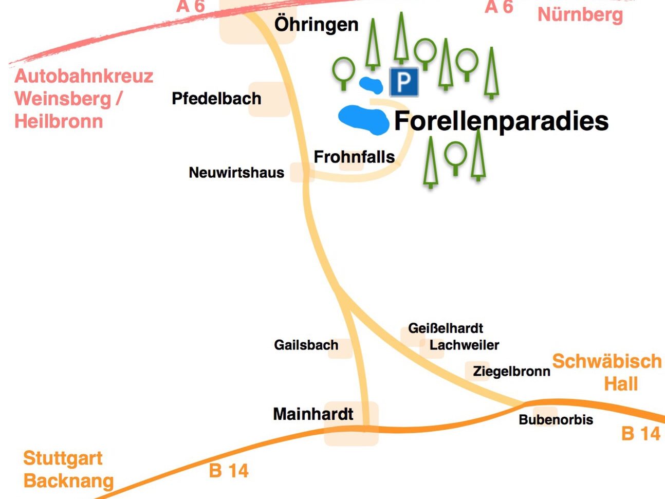 Fahren Sie von Mainhardt über Gailsbach Richtung Öhringen. Bei Frohnfalls/ Neuwirtshaus (ca. 2 km nach Gailsbach) sehen Sie die Beschilderung "Forellenparadies".
