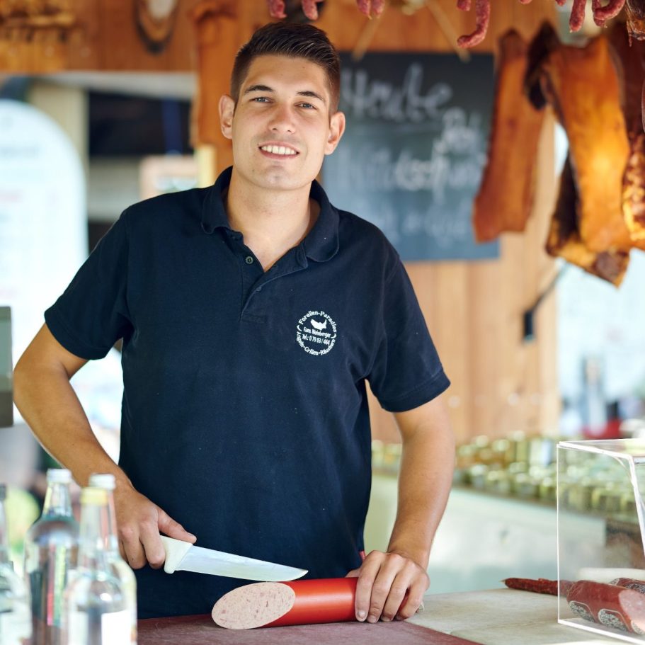 Metzgermeister und Geschäftsführer Jannik Weinberger trägt die Verantwortung für die Herstellung der Wurstspezialitäten. In seiner Funktion achtet er besonders darauf, jedes Produkt mit höchster Sorgfalt zu fertigen. Dabei legt er großen Wert auf Liebe zum Detail und stellt höchste Ansprüche an die Qualität seiner Erzeugnisse. Für Jannik Weinberger ist es selbstverständlich, dass diese Werte in jedem Arbeitsschritt zum Ausdruck kommen und sich in den fertigen Produkten widerspiegeln.